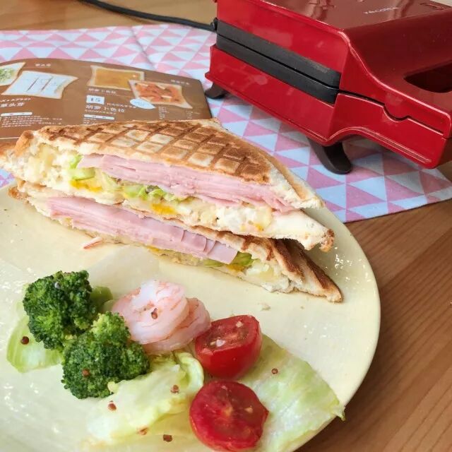 2. 盖好,压合。据食材调整烘烤时间,一个让人垂涎欲滴的饱满诱惑三明治就完成啦。