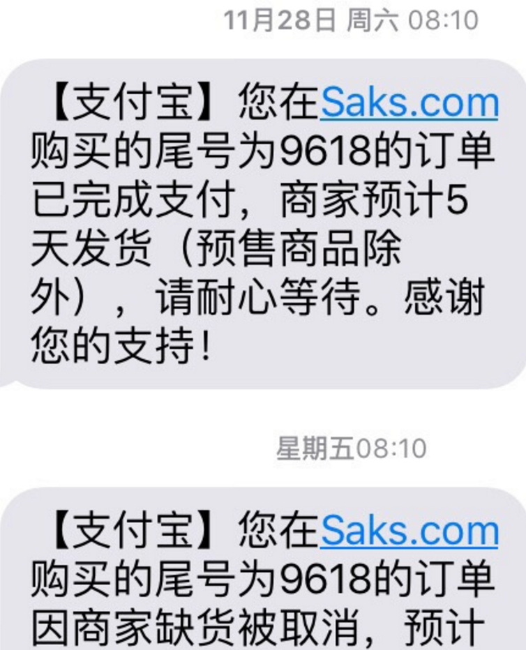 贡献一个编辑本人的心塞塞经历:saks因缺货而砍单,并且没有邮件通知。