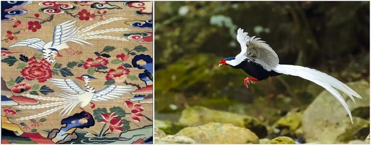 “翟”的年代里,“凤”也作为一个表示等级的鸟出现了,所以经常会有一些应该是“翟”的文物被叫成是“凤”,连带其他大多数雉类纹样也都容易被叫成“凤”。它们的确非常相似。要说区别的话,根据记载对比明代纹样,“翟”跟现实的长尾巴雉类更相似,比如它可能会更粗肥(更胖更好吃,一个狐狸舔着牙说),长长的尾巴也只是非常流畅的条状,没有其他装饰。而“凤”呢,不仅脑袋可能会多出一些装饰,身体也会更修长一点(更瘦更美丽),尾巴会有如火焰一般的锯齿状,后世还会在尾羽的末梢加上类似孔雀眼睛的装饰。不过别说现在的人搞不清楚了,其实连古人自己也常常搞混的。