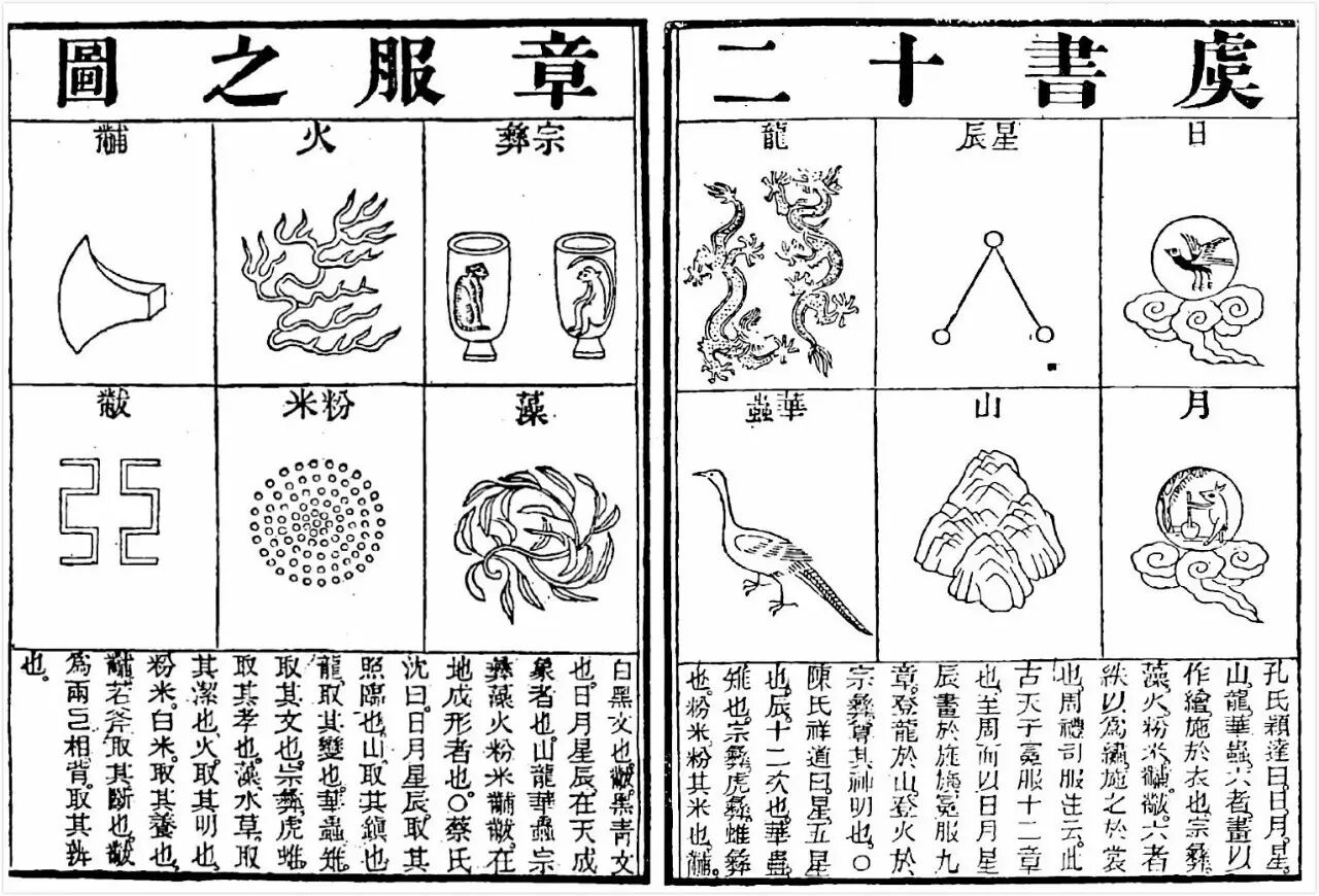 予欲觀古人之象,日、月、星辰、山、龍、華蟲作會;宗彝、藻、火、粉米、黼、黻,絺繡,以五采彰施于五色,作服,汝明。——《尚书》