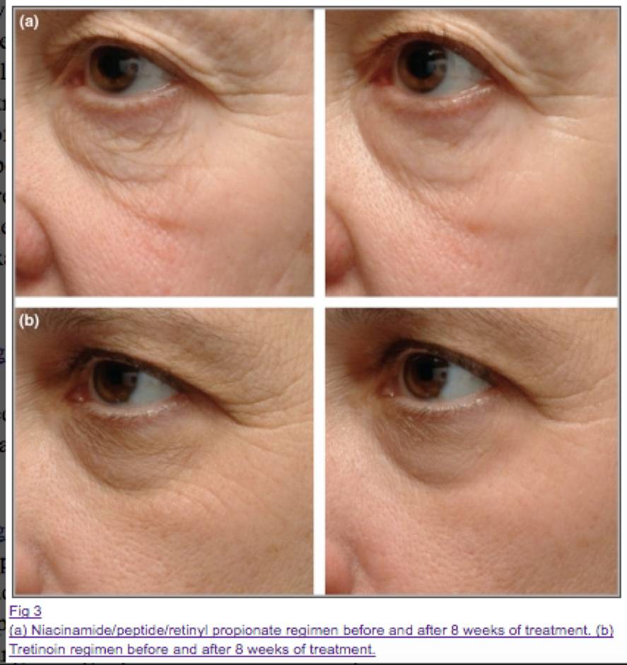 视黄醇丙酸酯(Retinyl Proprionate),这是一个比较新颖的视黄醇衍生物。在一篇宝洁集团的研究中,含0.3%丙酸视黄酯、肽和烟酰胺的产品,与0.02%的全反式维甲酸在改善皱纹方面有得一比。要问此含丙酸视黄酯、肽和烟酰胺的产品是什么?当然是宝洁公司的玉兰油Professional Pro-X Deep Wrinkle Treatment Anti Aging啦。