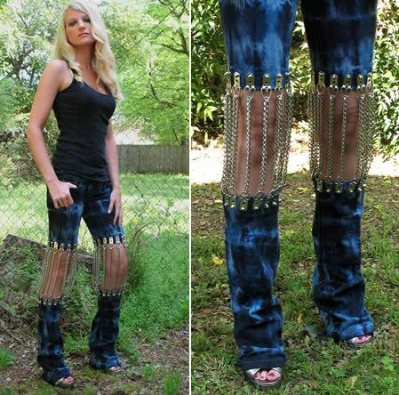 这位设计师把一条牛仔裤剪了,重新染了2次色,还给每个裤腿上装了28个夹子,用来固定一堆奇奇怪怪的链条。忽然想到,万一穿着这个裤子摔一跤膝盖着地,后果真是不堪设想啊……