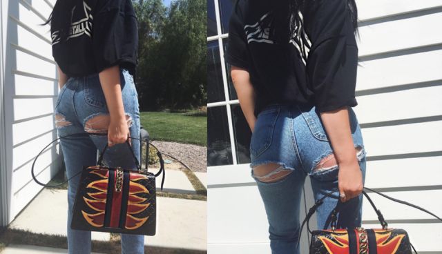 这张照片来源于“金小小妹”凯莉·詹娜(Kylie Jenner)自己的Instagram,作为卡戴珊家族最小的妹妹,詹娜是2017年Ins上最受关注的十大人物之一。也是从詹娜po出这几张照片开始,人们对牛仔裤破洞位置的兴趣发生了转变:从膝盖破洞转移到了臀部破洞。当然了,不少人在社交媒体上热烈议论金小小妹的这条牛仔裤,但显然只有少数会把这样的裤子穿到自己身上。