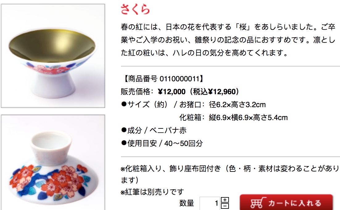 红花红色素提纯后是一种有金属光泽的固体,可以用于各种需要染红的场合,当然也包括口红。江户时代的口红品牌叫做“小町红”,是把红花红色素刷在小瓷碗内侧出售的,用的时候用湿毛笔蘸着在嘴唇上涂画。十九世纪初江户的流行唇色是用小町红在嘴唇上涂很多层,干燥以后就会表现出金属绿色光泽,日语中叫做笹色或者玉虫色,“笹”就是竹叶,“玉虫”指的是吉丁虫,都是绿色的东西。