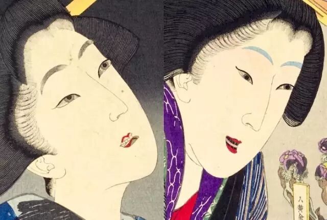 江户时代《风俗三十二相》浮世绘中的女性妆容。左边是自然眉,白齿的年轻姑娘,右边是化眉黑齿的妇人。图片:マツイイチロウ / edo-g.com
