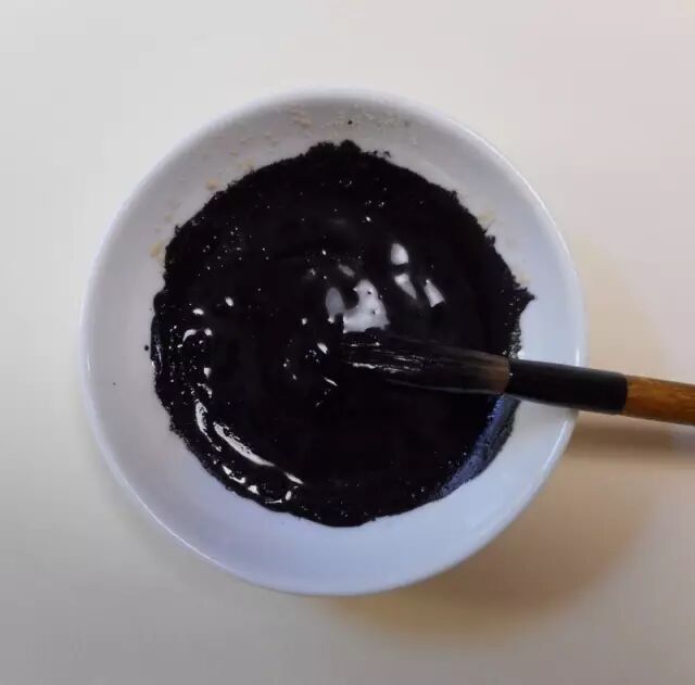 用鞣酸、硫酸亚铁、碳酸钙制成的现代复现品溶于水后的效果。图片:yamamura-kesho / ameblo.jp