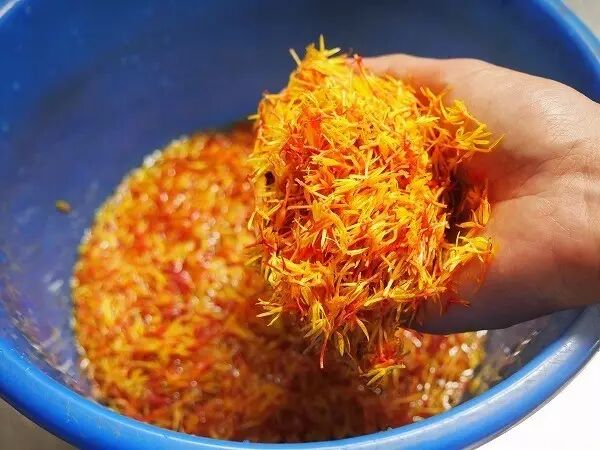 看来中日古人加工红花的方法大同小异,这是因为红花的花瓣中含有红花红色素和红花黄色素,顾名思义,颜色一红一黄,加工的第一步就是要把这两种色素分离开。红花黄色素易溶于水,红色素难溶于中性的水,在碱性环境下溶解度才能升高,所以在加工时都需要先用水溶解掉黄色素,利用微生物发酵释放出的有机酸令红色素沉淀,再用含有碳酸钙成分的碱性河水和苎麻纤维将红色素提纯出来。