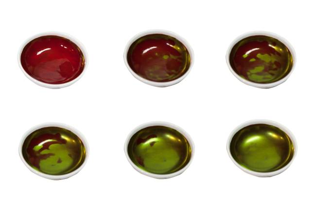 用湿毛笔蘸后就会由绿转红。图片:amu-zen