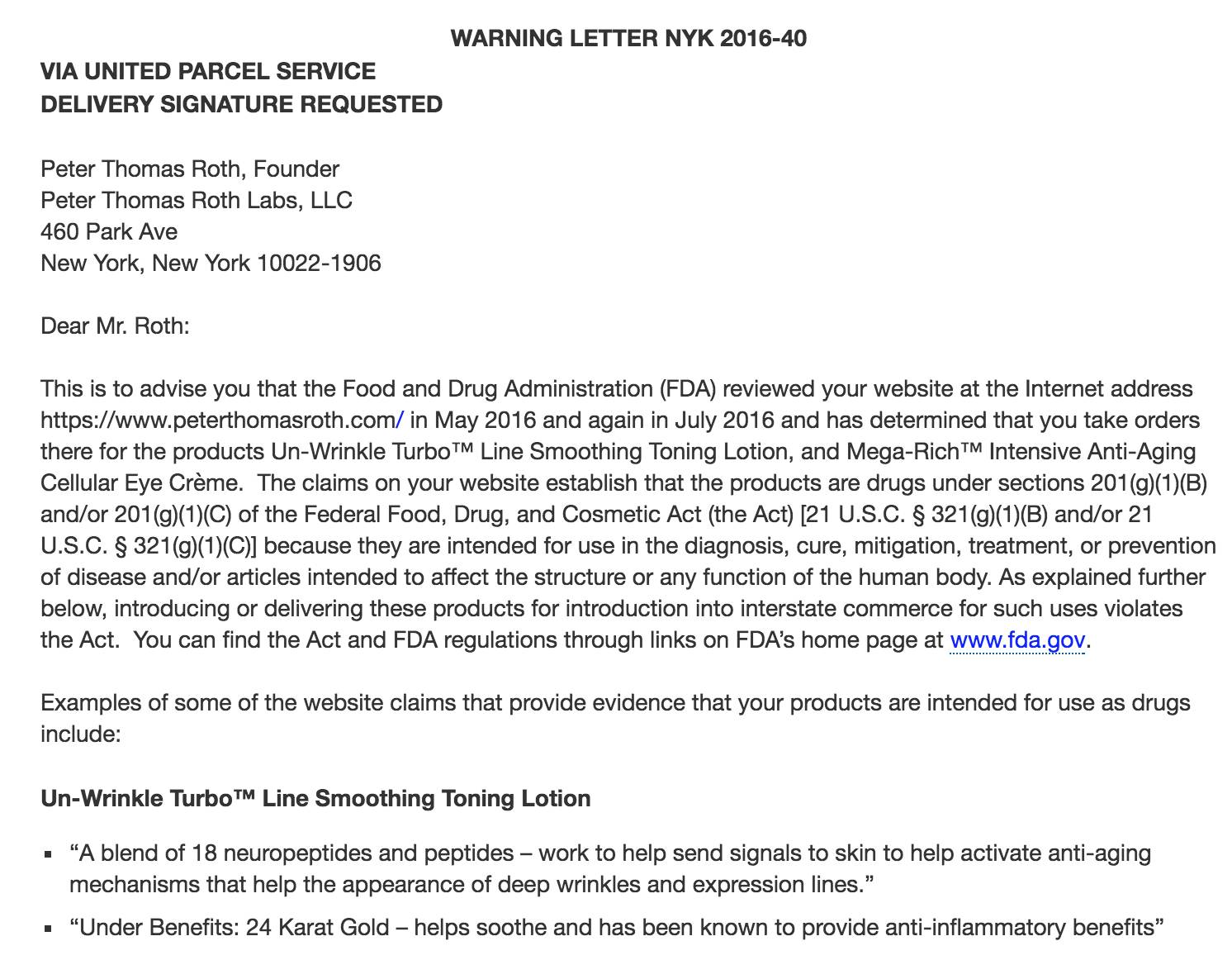 反面例子是彼得罗夫,他们就总是收到 FDA 的警告信,让他们赶紧把一些产品注册为 new drug「新药」,不然不能在产品描述里写那些除皱什么的宣传语。
