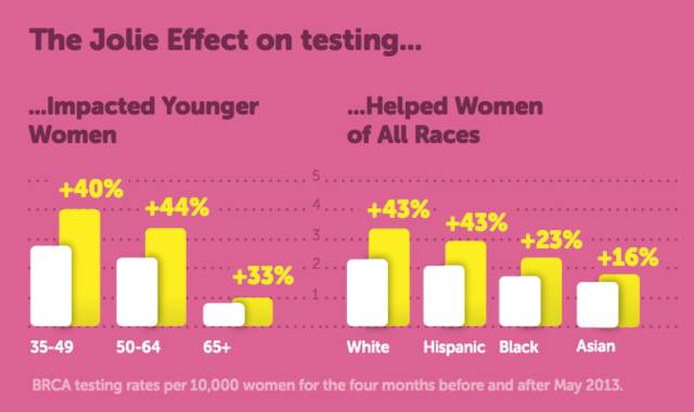 比如,美国明星安吉丽娜·朱莉(Angelina Jolie)曾在2013年宣布由于家族基因的原因,选择切除双侧乳腺切除术以降低罹患乳腺癌和卵巢癌的风险,并呼吁全球女性关注自身健康。她的这一举动引发了“安吉丽娜·朱莉效应”。研究表明,在朱莉发表声明后的两个月内,提交基因检测申请的女性数目增加至2012年同期的2.5倍。