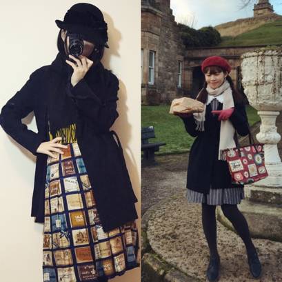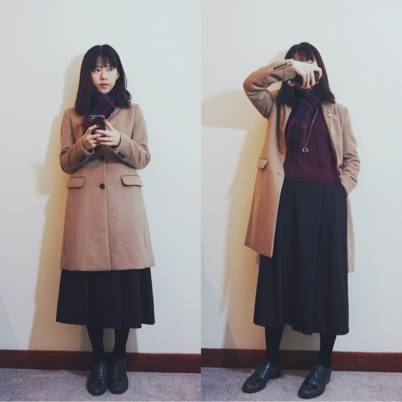 用身高一米六的作者自己举例,我穿这件优衣库三粒扣大衣搭配长裤裙,左图比较显矮,右图把大衣解开露出里面短款的毛衣,就像变成了一米六五(也没有高多少好吗?)。