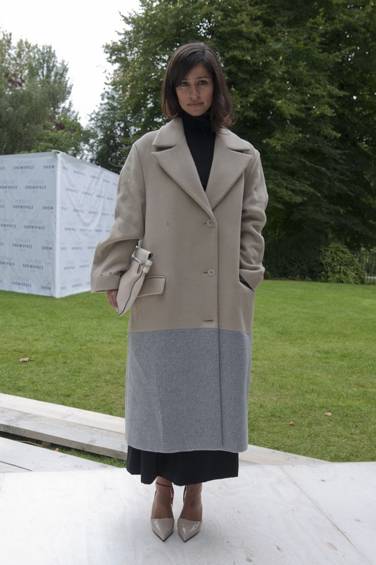 这件大衣不对称的前襟本身有种包覆感,整体裁剪简洁笔挺而合身,加上一条宽皮带对腰线的强调,使人看起来干练又优雅。