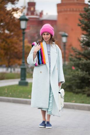 H型短大衣里搭配一件比较宽松的毛衣,也可以起到遮盖较胖部位的效果,而且让衣服层次感更强。