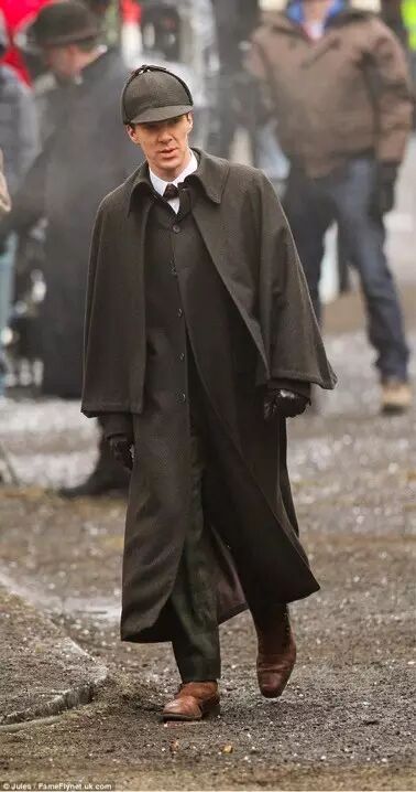 原著中提到过,福尔摩斯穿着一件“厄尔斯特”大衣(ulster)。厄尔斯特大衣最初是一种供工作日穿着的大衣,领子较小、单排扣,带一个长度及髋部的斗篷用于保暖。这种大衣通常使用比较耐磨的面料,比如人字呢或者粗花呢制作,而福尔摩斯探案集中《血字的研究》《四签名》《波西米亚丑闻》《蓝宝石案》以及《贵族单身汉》都提到了这款大衣。在维多利亚时期,这种大衣不能算是正装,到了爱德华时期,这种厚重的大衣省去了斗篷,但仍然以双排扣的款式存在。(然而这件大衣华生穿就要拖地了)