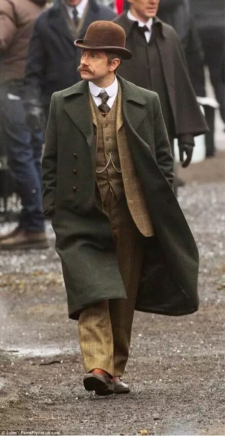 19世纪末,三件套西装依旧流行,搭配方法可以是。在经典的格兰纳达版《福尔摩斯探案集》中,华生的整体色调以棕色黑色为主,以和福尔摩斯区分,而且他经常去各地出诊,所以穿得相对福尔摩斯更加日常和“运动”。在2016特辑中,华生的所有装束都是格纹或者斜纹的羊毛呢三件套,马夹也采用和上衣裤子同种的材质。