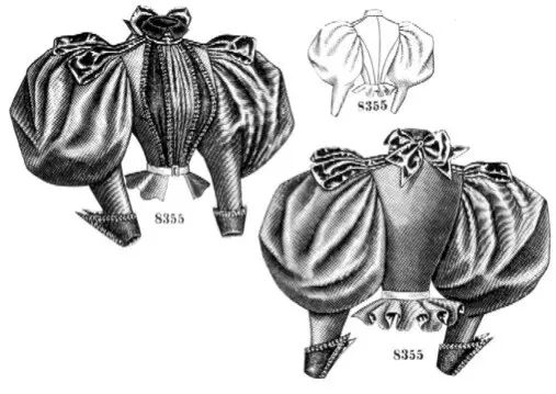 到了90年代中期,羊腿袖(leg o'mutton sleeves)开始流行,也就是那种上面大下面窄的泡泡袖,而且一年比一年更夸张。物极必反(误),终于,这种款式在大概1906年彻底消失了。