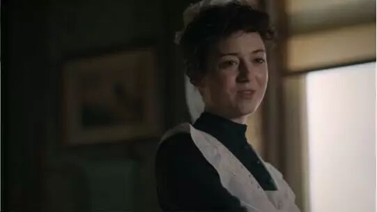 90年代初期的发型基本延续上一个十年的风格,前额卷卷的碎头发帘配上高高梳起的发髻。比如下图中华生家的女佣这种造型就很有代表性。