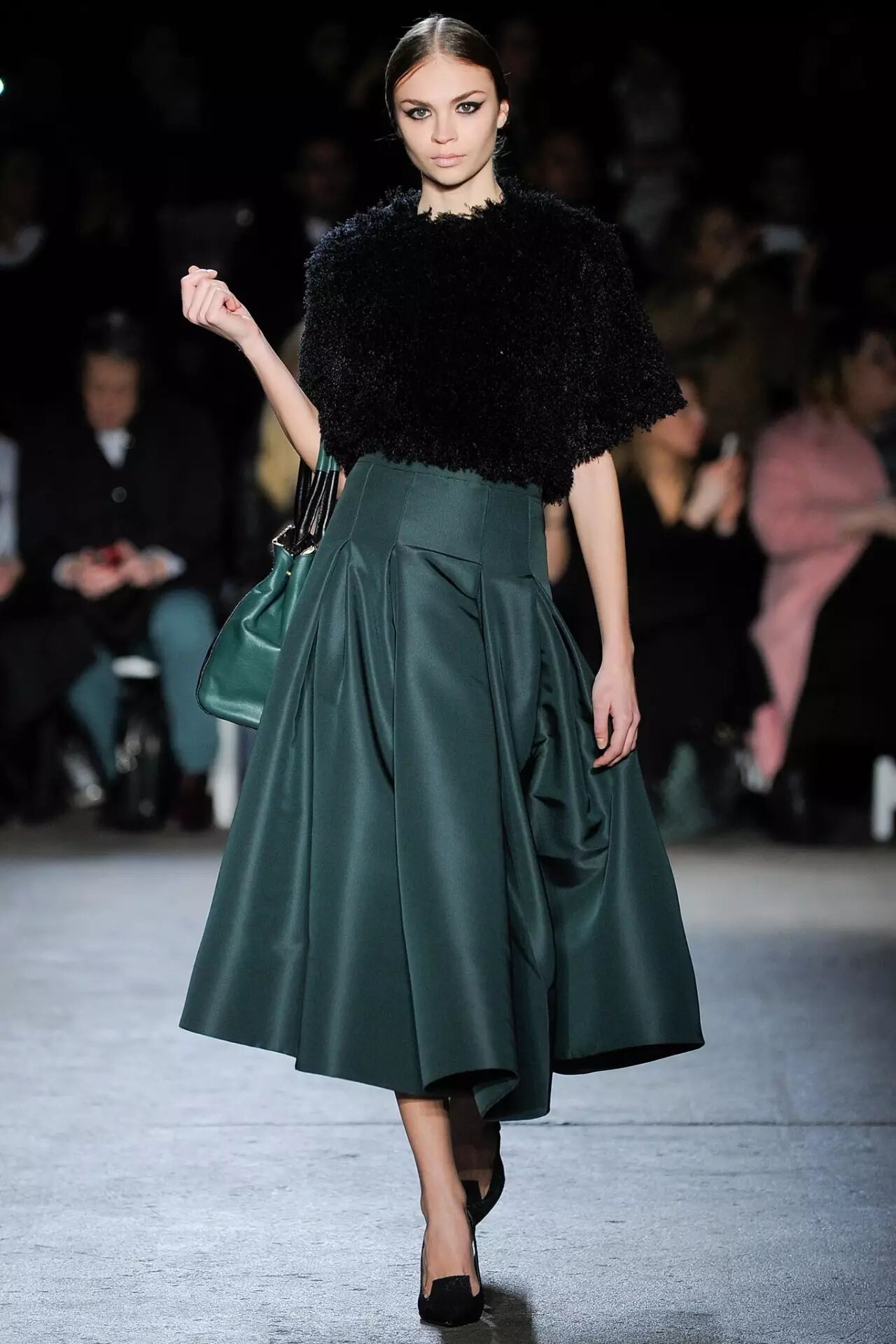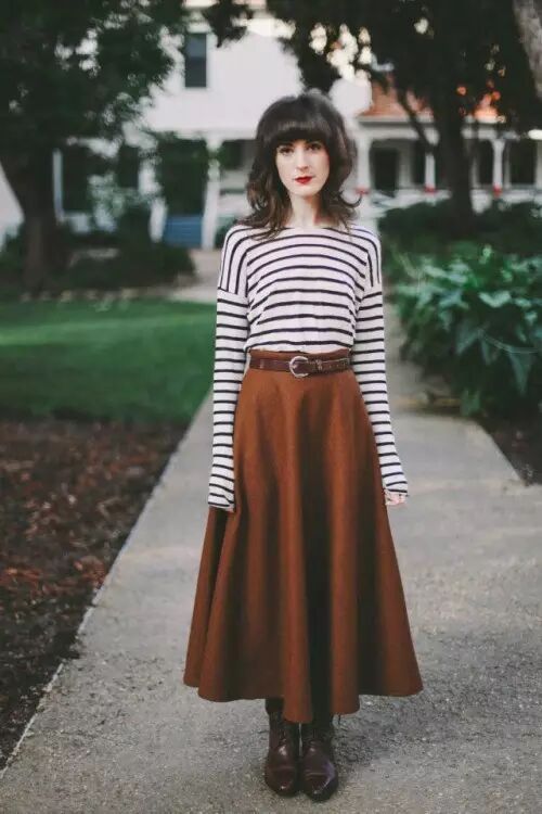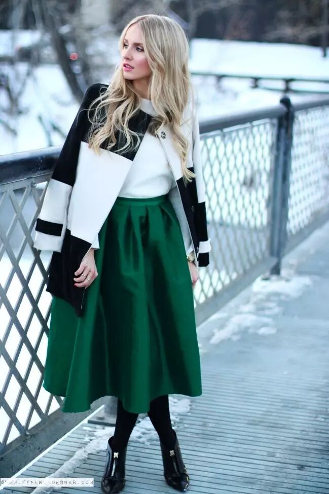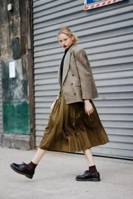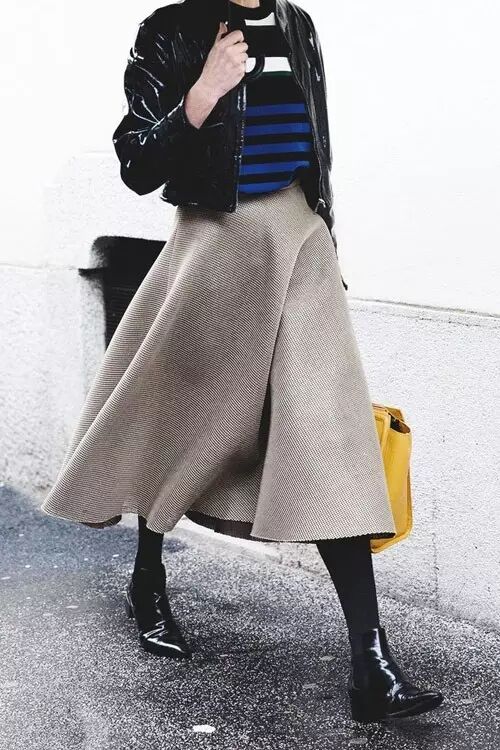 从膝盖以下一直到小腿,这个长度的裙子统称迷笛裙(midi skirt)。早先步入时尚界时候也是火到不行,后来为啥过气了?长度太长!超短裙开始统治时尚界,露大腿才是正经事。不过天都冷到这个份儿上了,露大腿应该也不是第一需求了吧?