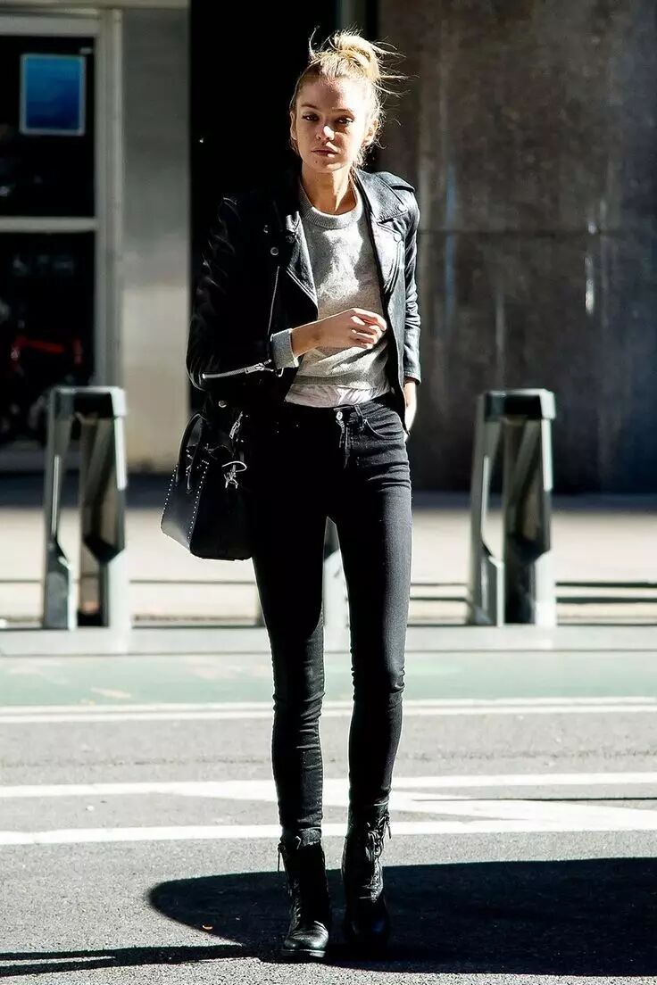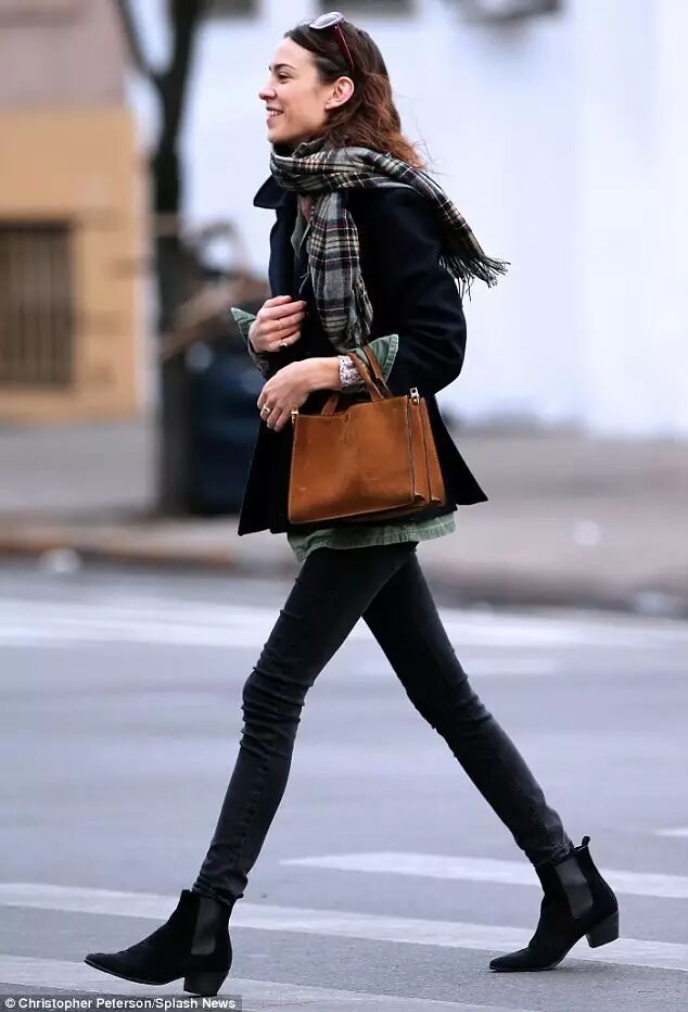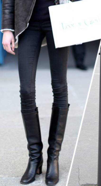 上衣短一些,再搭配高腰紧腿裤,是另一个不错的思路。外衣从牛仔外套、毛衣、皮衣到羽绒服都可以,毕竟冬天还是要考虑到保暖因素。而skinny jeans则负责修饰你的腿型,让你整个人看上去非常干练。