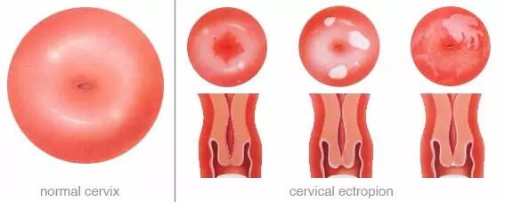 左边是正常的宫颈,右边是出现“宫颈糜烂”,颜色发红的宫颈。为了不吓到大家我就不放照片了,给个示意图你们感受一下。