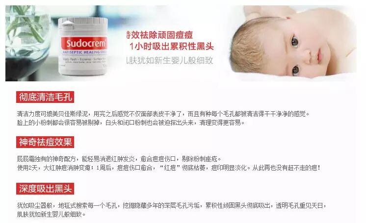 英国生产的复方氧化锌乳膏“sudocrem”——就是那个屁屁霜,虽然现在已经过了最火的时候,但依然余威不减。商家宣传这个霜可以“去除黑头粉刺”,甚至还可以拿来“做面膜”。