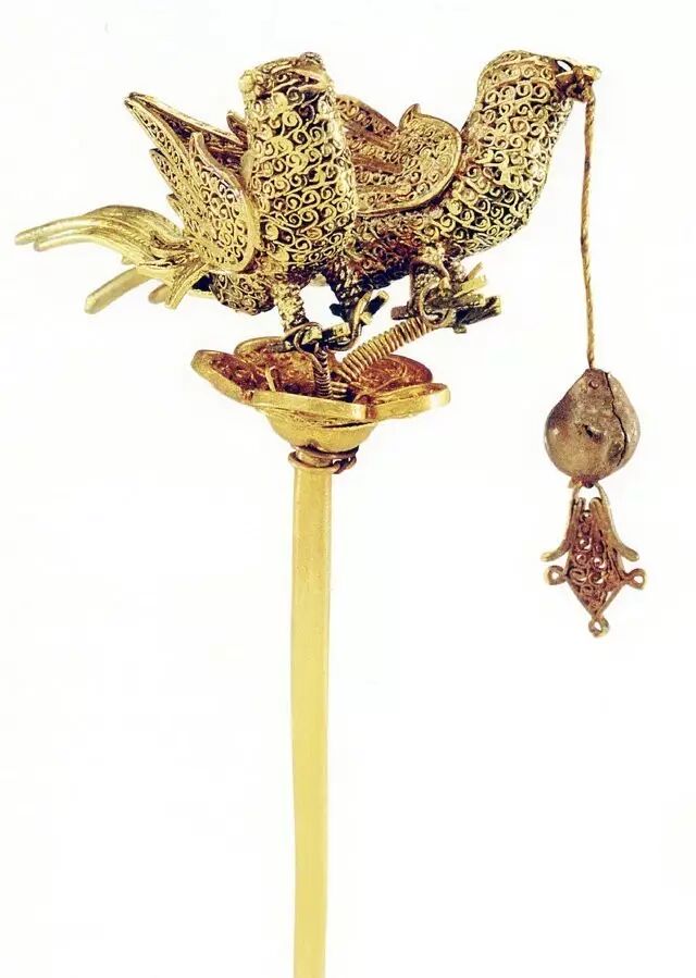 下面这张图,簪子顶端的“珠结”散了或烂了,只剩下金属身子。可以看得出它的柄很长,且是直立使用的(如果直接放脑袋上应该可以戳穿天灵盖)。