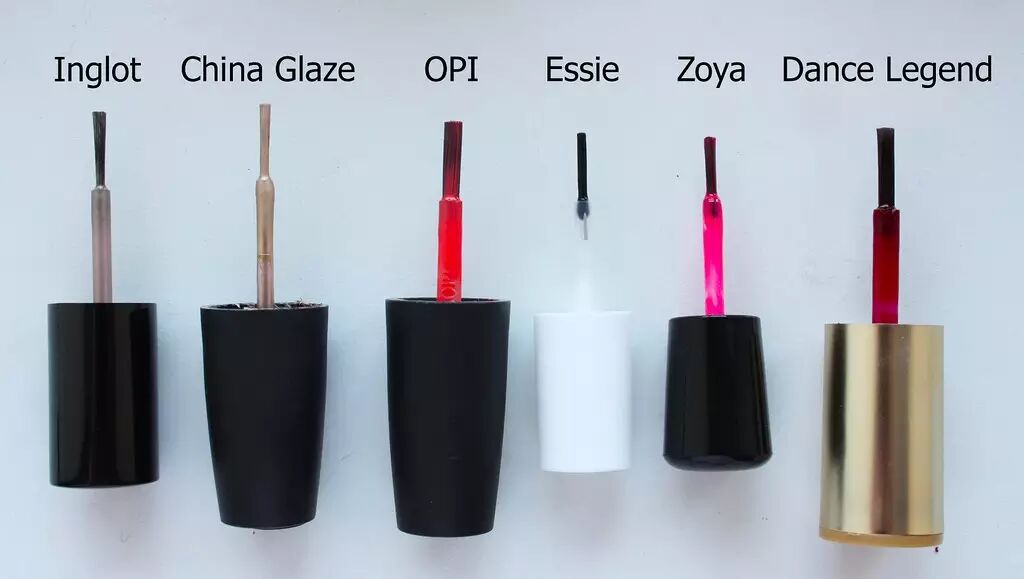 各指甲油品牌刷头对比。Zoya就是典型的小刷头,OPI则是最适宜新手使用的宽刷头。