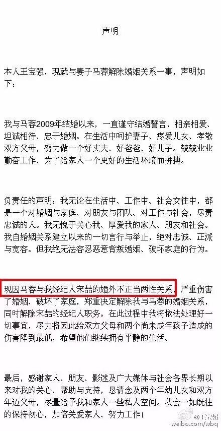 大概是爱之深恨之切吧,如今王宝强这份离婚声明也是不客气,直接点出了离婚的原因是妻子马蓉和自己的经纪人有染。