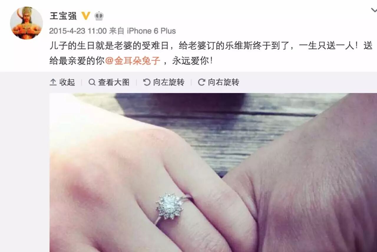 去年4月二人还在秀恩爱,王宝强还给妻子买了戒指。