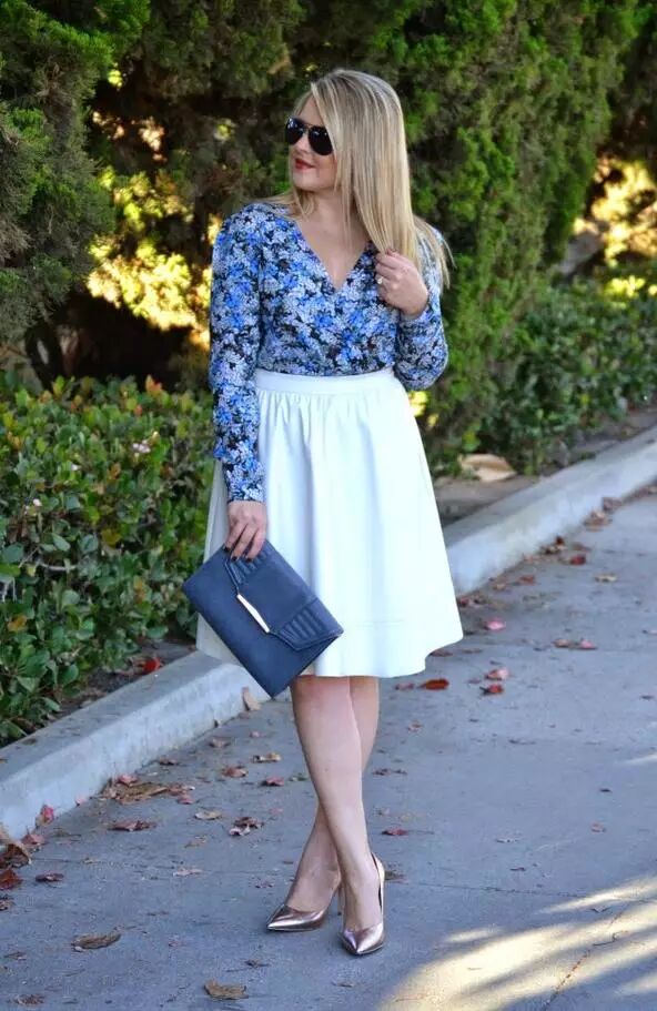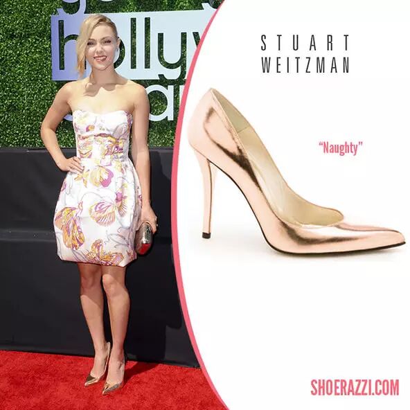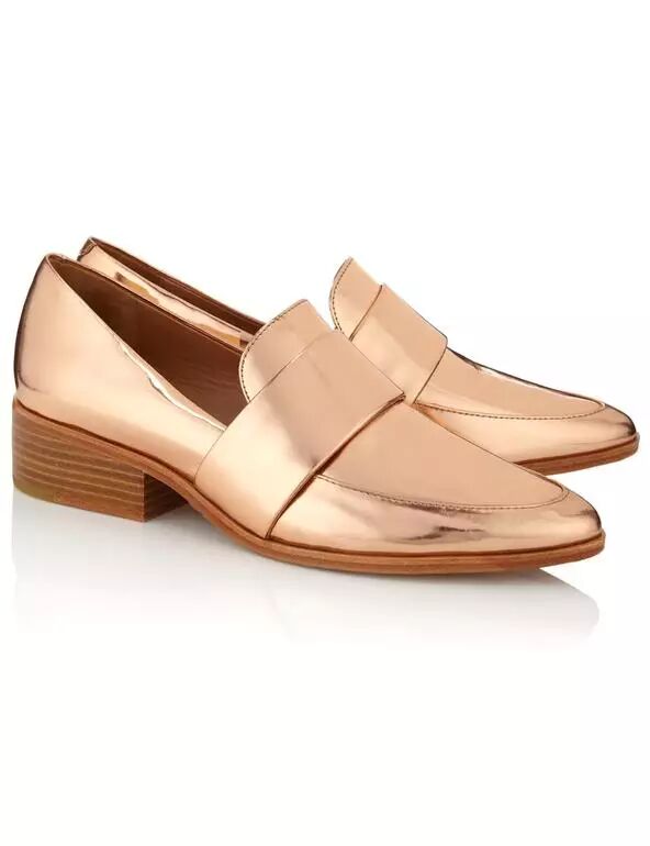 再说说鞋。我是觉得金属光泽的是会显得脚大的,比如下面这种:非高跟+尖头+亮色——但万一你脚小腿长肤白貌美呢!