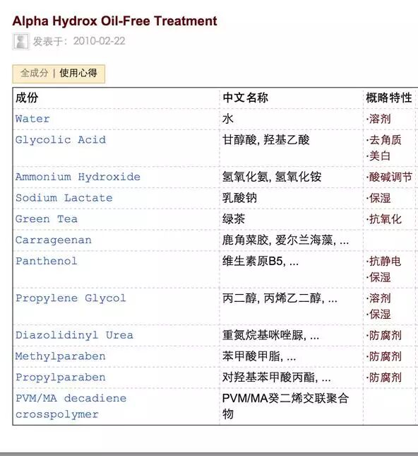 进入正题,下面是我目前在用的几个酸。在这里就不说成分了,成分表列出来给大家作为使用参考,此帖只描述本人在用过这些酸类护肤品后的皮肤现象,每种单品已坚持使用超过一年,不知道够有说服力没有呢~