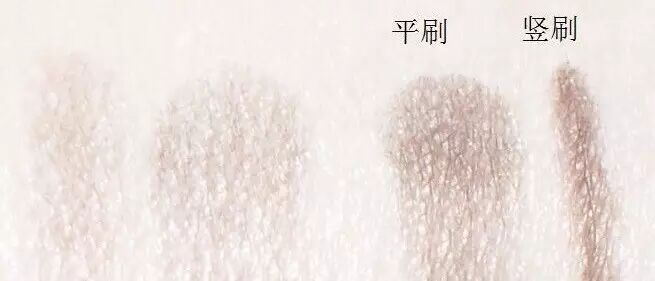 先看效果,两把刷子分别刷同一个眼影粉。右边是239刷型的妆效,明显的深着色,甚至有刷不开的色块;左边不论是平刷、竖刷,是不是更雾感又均匀?