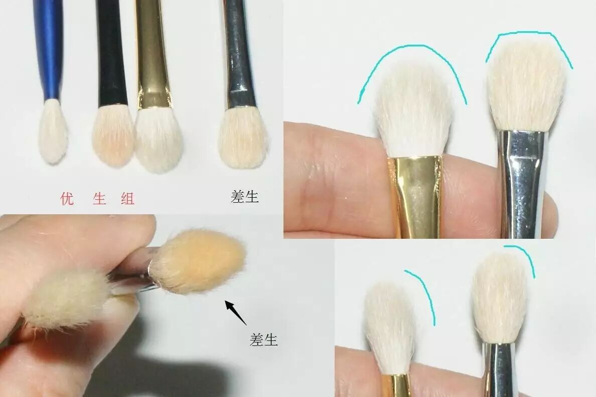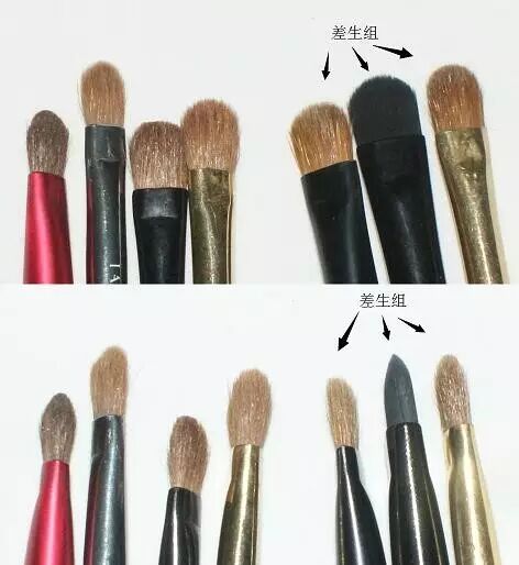 大小各异的小号眼影刷,刷型同样有优劣之别。左面刷毛丰厚弧度自然,右面又薄又平。