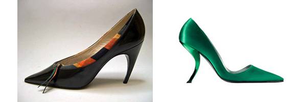 上面两个细跟,向外弯或者向内弯,都会被称为Comma Heels逗号跟。香蕉跟则是内弯且粗,极像香蕉。左右两图的鞋均来自Roger Viver。