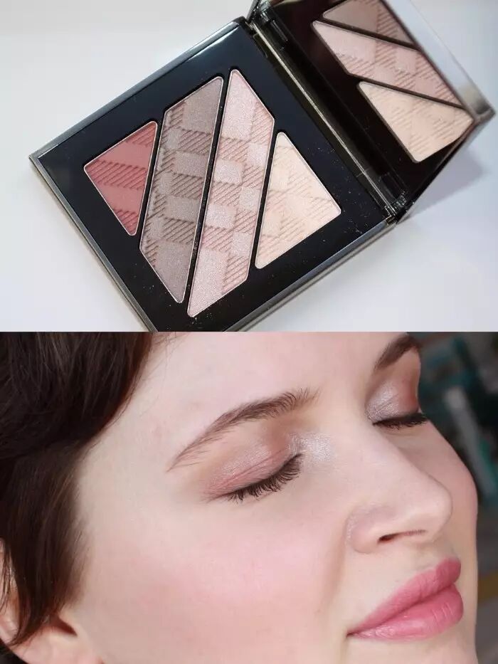 ↑我曾经在网上功课Burberry的眼影盘如上图,盘子里的配色很戳人对吧,多么温柔粉嫩啊!加上我找到的下面的博主试色又是非常的美丽,于是没有多想下了单。然而实际上脸时却傻眼了,因为这盘的颜色太浅淡又太冷清了,在我眼上只是雾蒙蒙发灰的感觉。我才恍然意识到,看功课时忘了人家多白,我多黄这件事……冲动购物真可怕。