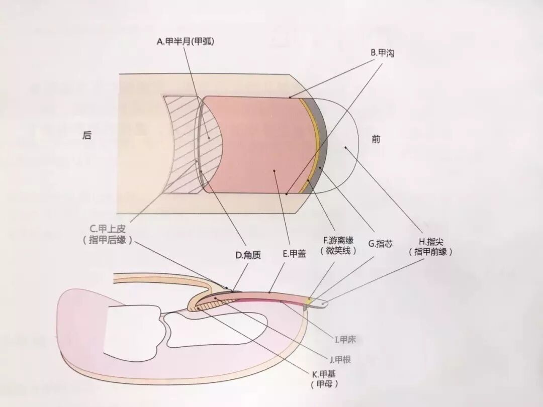 这是一个指甲的结构图,F游离线以内就是I甲床的区域。不涂甲油的时候正面看指甲,游离线如果低于指腹,那么这段空间就是日后可以育成甲床的地方。