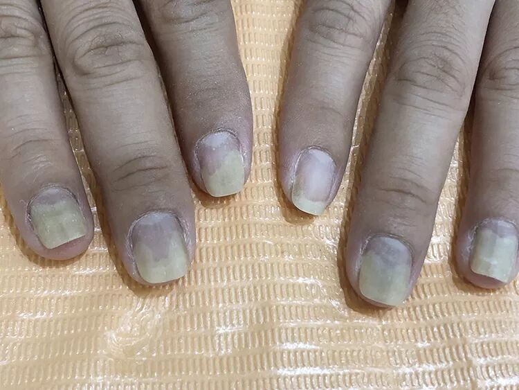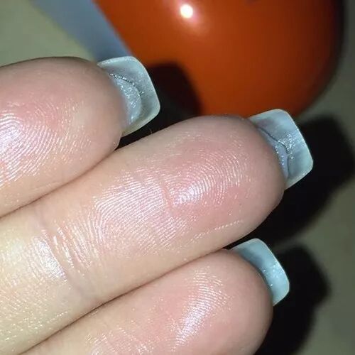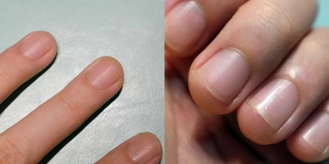 有育成空间的指甲,也有两种情况。一种是整个游离线后退,一种是呈不规则的V型,两侧后退。然后需要特别排除的,就是真菌感染或者过敏造成的空甲(见下图),比如说洗涤剂啊,或者没有硬化的光疗胶等等滴进了指甲缝里,导致过敏的。这些情况需要先处理好感染和过敏,好了之后再来育甲床。
