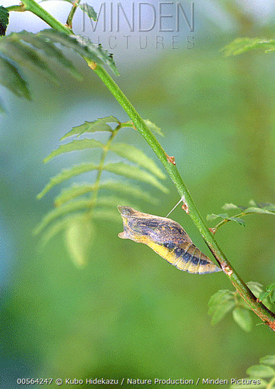 五龄幼虫化蛹前会不吃不喝进入前蛹期。之后它们会找到合适的地方化蛹,通常是用一根丝将自己的身体斜挂在树枝上,看上去像上吊,因此这种蛹被称为缢蛹。