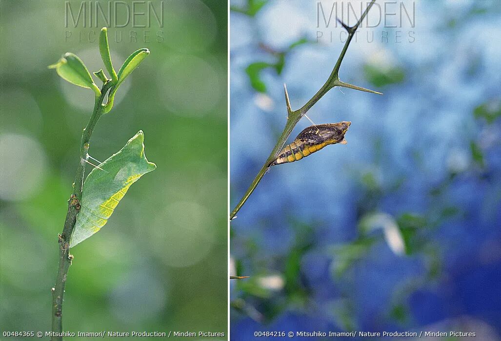 柑橘凤蝶的蛹有绿色型和褐色型两种,花纹和质感都与环境非常接近。越冬的蛹会在第二年的春天羽化成蝶,雄蝶会先羽化出来,等待雌蝶羽化后伺机求偶和交配。