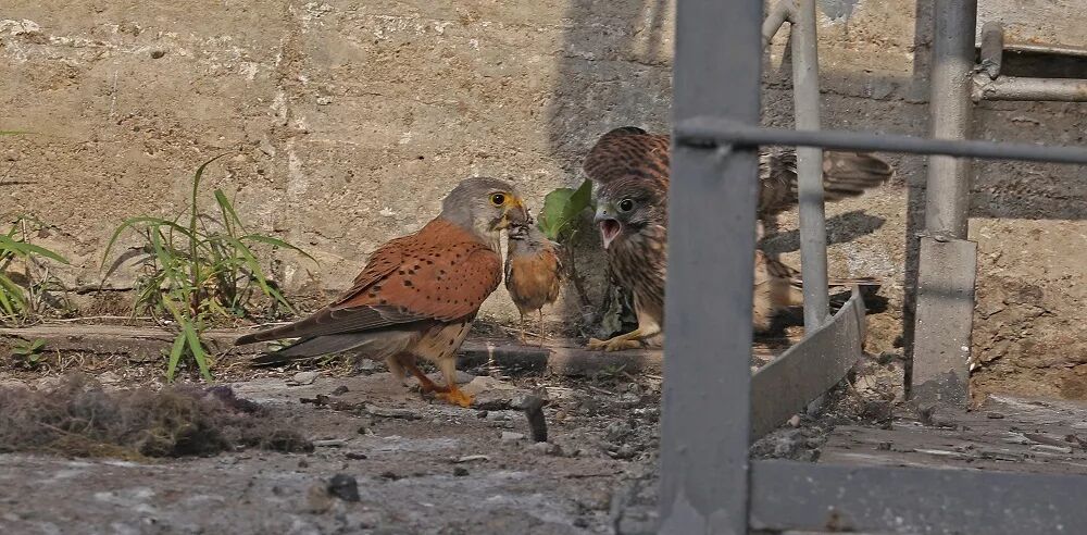 红隼捉到戈氏岩鹀[wú](Emberiza godlewskii)喂给幼鸟。图片:章海涛