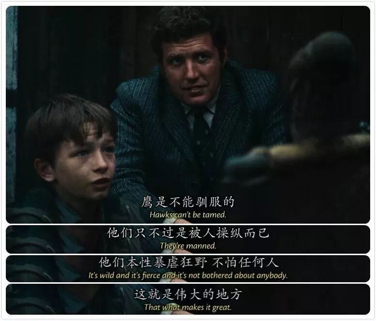 比利:我知道。这就是她让我着迷的原因。我带鸟出去的时候有人说:‘快看啊,这是比利•卡斯柏和他的宠物鹰。’我就大声喊:‘他不是宠物。’或者有人说:‘这鸟是不是驯过的?’驯过的?!鹰是不能被驯服的,他们只不过是被人操纵而已。他们本性狂野不羁,不怕任何人,也不怕我,这就是最伟大的地方。