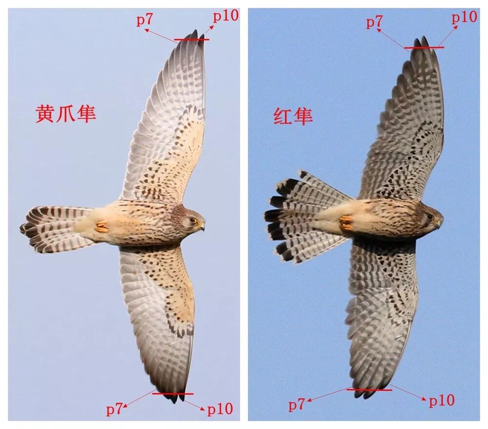 红隼的初级飞羽,从里往外数的第七片(也就是从外往里数的第四片)和第十片(从外往里数的第一片),是一样长的。黄爪隼不然,第十片初级飞羽比第七片长一点,多出一个羽毛尖的长度。