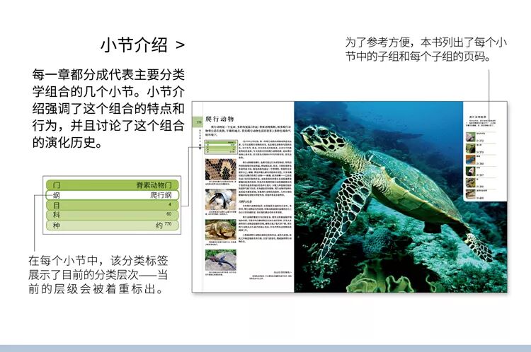 每个小节都有一套结构,从分类标签开始,将小节分为若干“子组”,不但选出了一些物种进行“特写”介绍,还尽可能多地列出了相关物种。