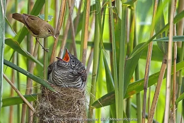 由芦苇莺(Acrocephalus scirpaceus)喂养的大杜鹃雏鸟。图片:Thomas Hinsche / BIA / Minden Pictures