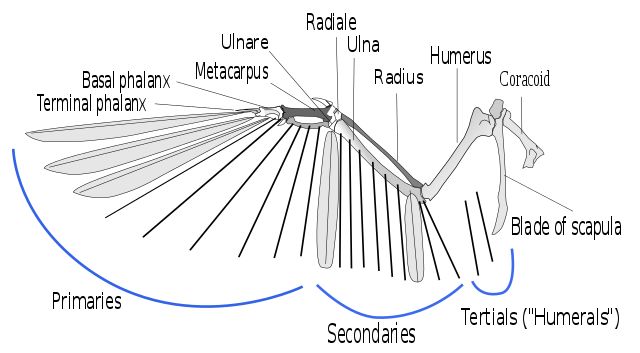 翅膀解剖图,展示了初级飞羽(Primaries)和次级飞羽(Secondaries)的生长位置。绝大多数鸟类有十枚初级飞羽,少数有九枚。图片:L. Shyamal / Wikimedia Commons