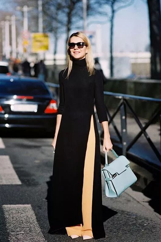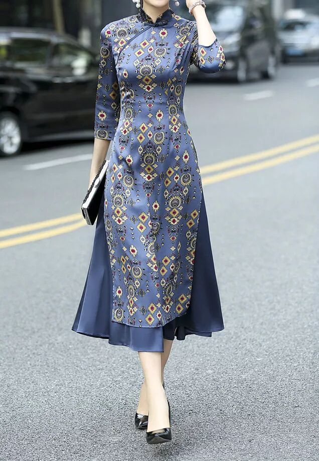 有人会觉得这样穿旗袍很像越南奥黛,其实两者的区别在于,奥黛是从上衣发展而来的,所以搭配裤子是必然的;旗袍则是从袍类服饰而来,当它越来越像连衣裙后裤子就被省略了。而且奥黛的开衩很高,从腰部就开始了,导致裤子肯定会露出来;旗袍搭配裤子则有一种欲说还休的隐蔽性。但是殊途同归,从奥黛中吸取思路,设计出更多搭配长裤的旗袍,不失为现成的“捷径”。