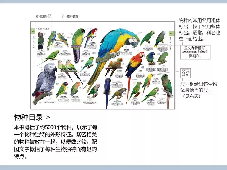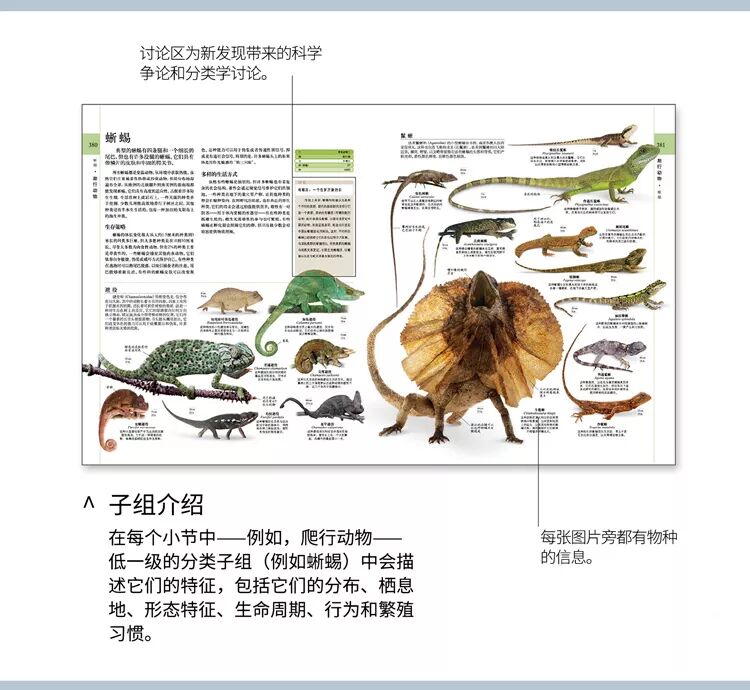 每个小节都有一套结构,从分类标签开始,将小节分为若干“子组”,不但选出了一些物种进行“特写”介绍,还尽可能多地列出了相关物种。