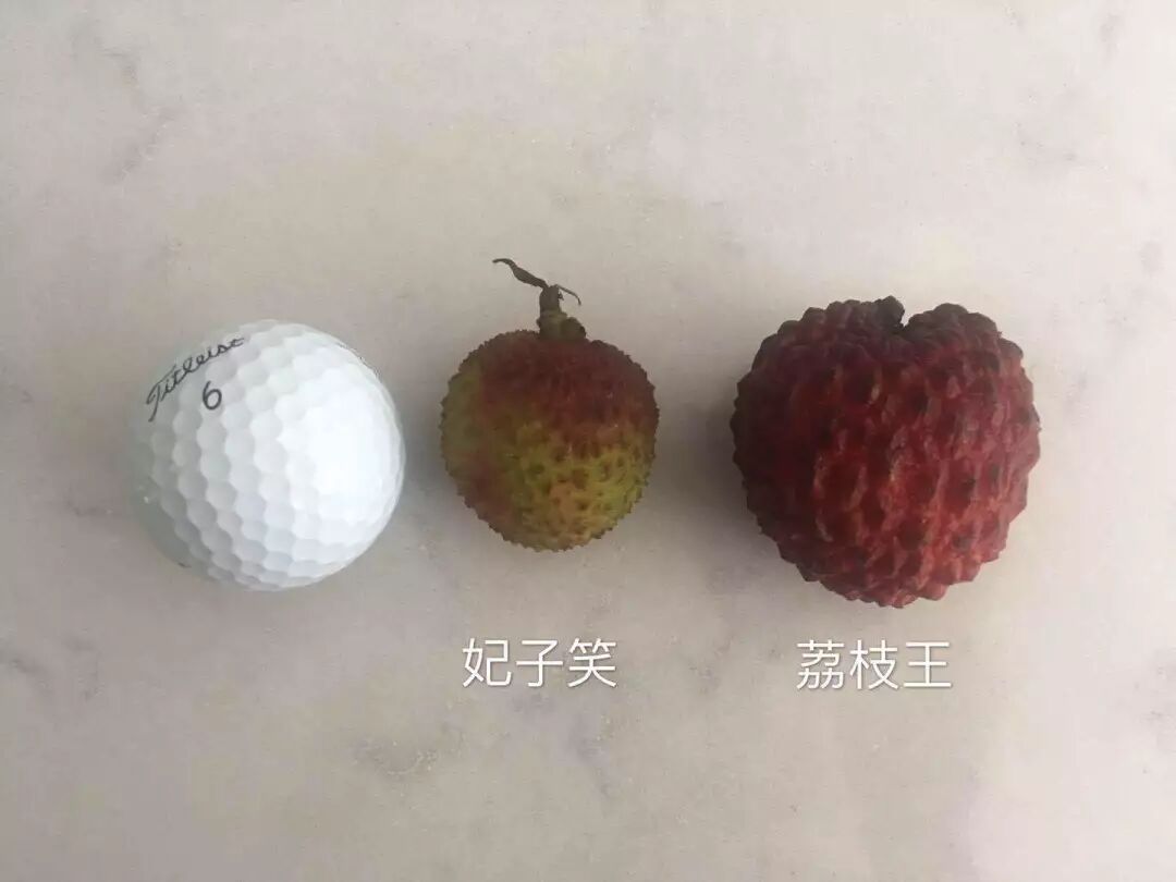 荔枝品种妃子笑和海南荔枝王(不是挂绿)的大小比较。图片:球藻