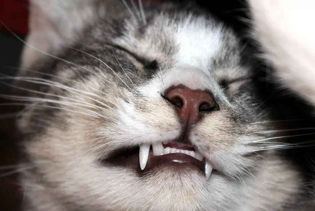 当恒牙试图萌出,乳牙的牙根会逐渐溶解、变短,直到变为牙冠底下不起眼的断茬。所以如果家里主子在四个月到半岁时吐出了白白的一截牙齿,下面还有参差不齐、带着血丝的断口,可能是换牙了!也许会有轻微出血,不要惊慌,它们要换二十多颗。当然,有时会碰到比较顽固的乳牙——恒牙已经长出来了就是不掉。这时两颗新旧牙齿挤在一起可能引起口腔问题,比如塞牙、口臭之类的。解决方法很简单:找兽医拔掉乳牙。