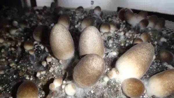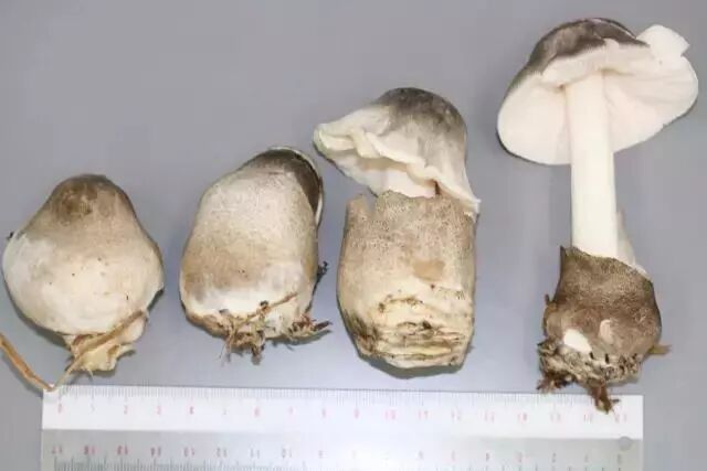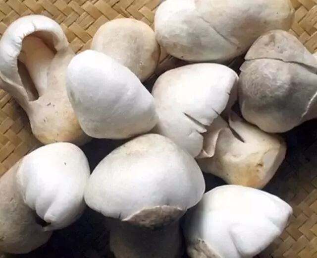 草菇的子实体发育前期是一个圆滚滚的蛋,这是它的菌托包被在最外面形成的结构,《英德县续志》中说这时候的草菇是“出蓓蕾如珠”,需要“即须采取,剖开焙干”,“若过时不采,则开如伞形,俗名老菇婆,其价顿贬。”